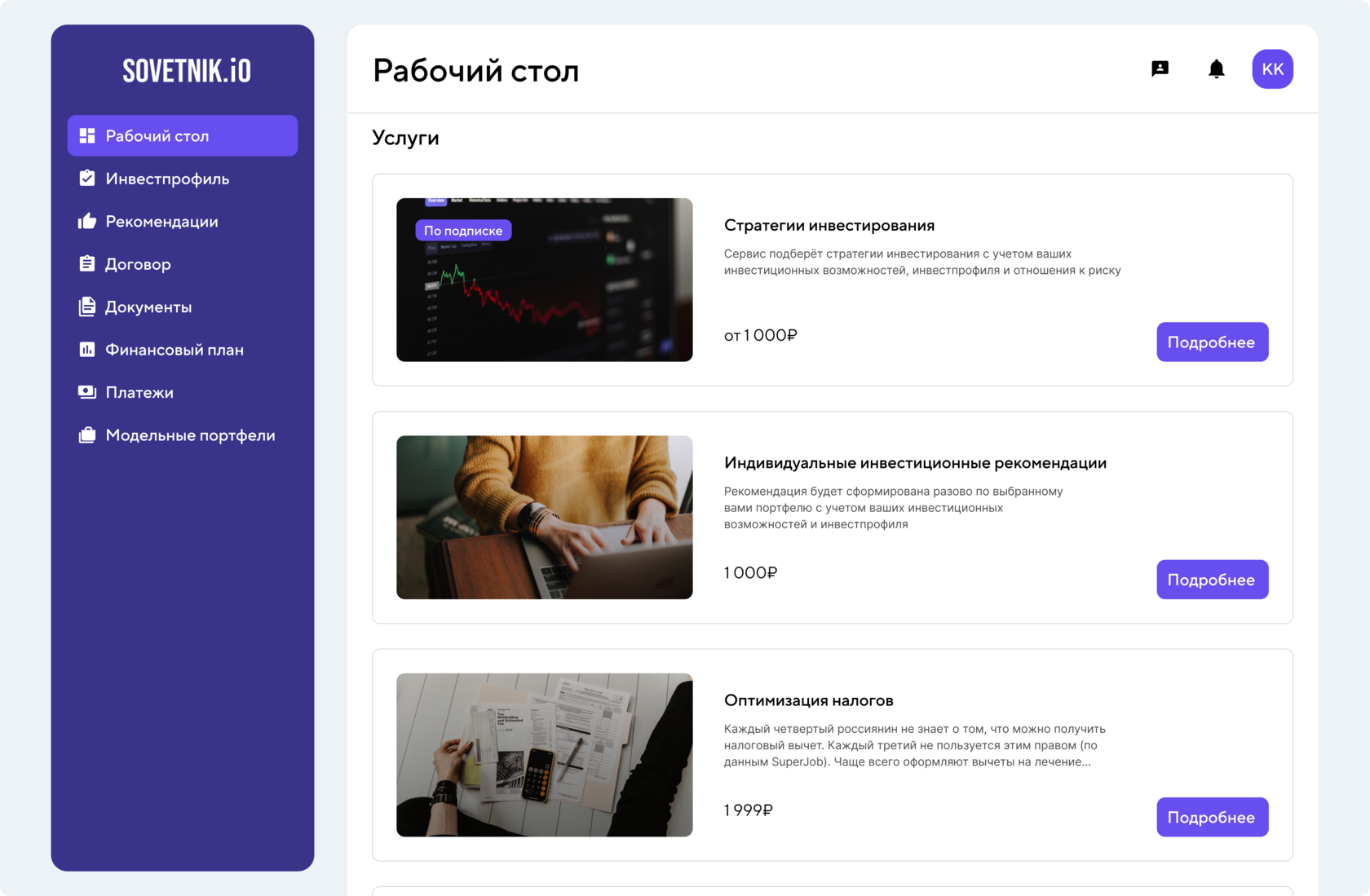 Клиент получает удобный и современный личный кабинет для взаимодействия с советником: подписание документов, мониторинг портфелей, получение рекомендаций, общение по видео, в telegram и др.