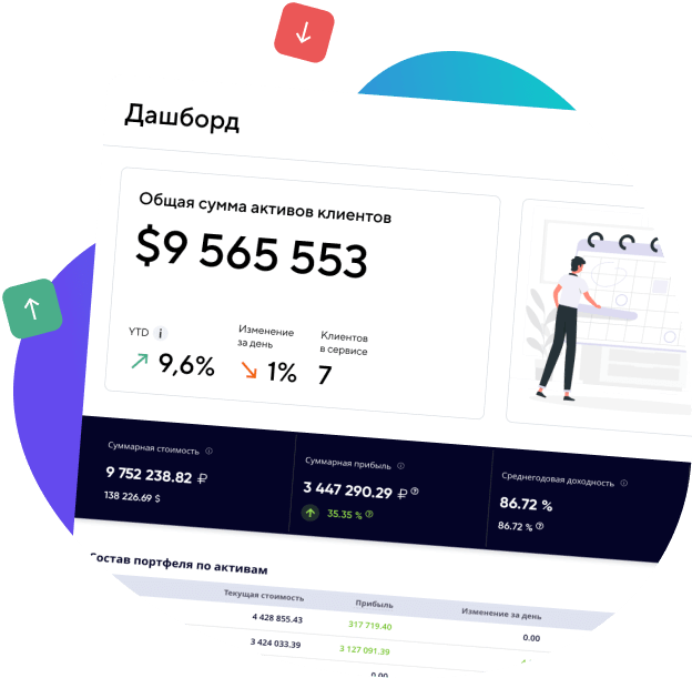 Информация обо всех инвестиционных портфелях клиента в одном окне. Подробная аналитика и поддержка большого количества брокеров.